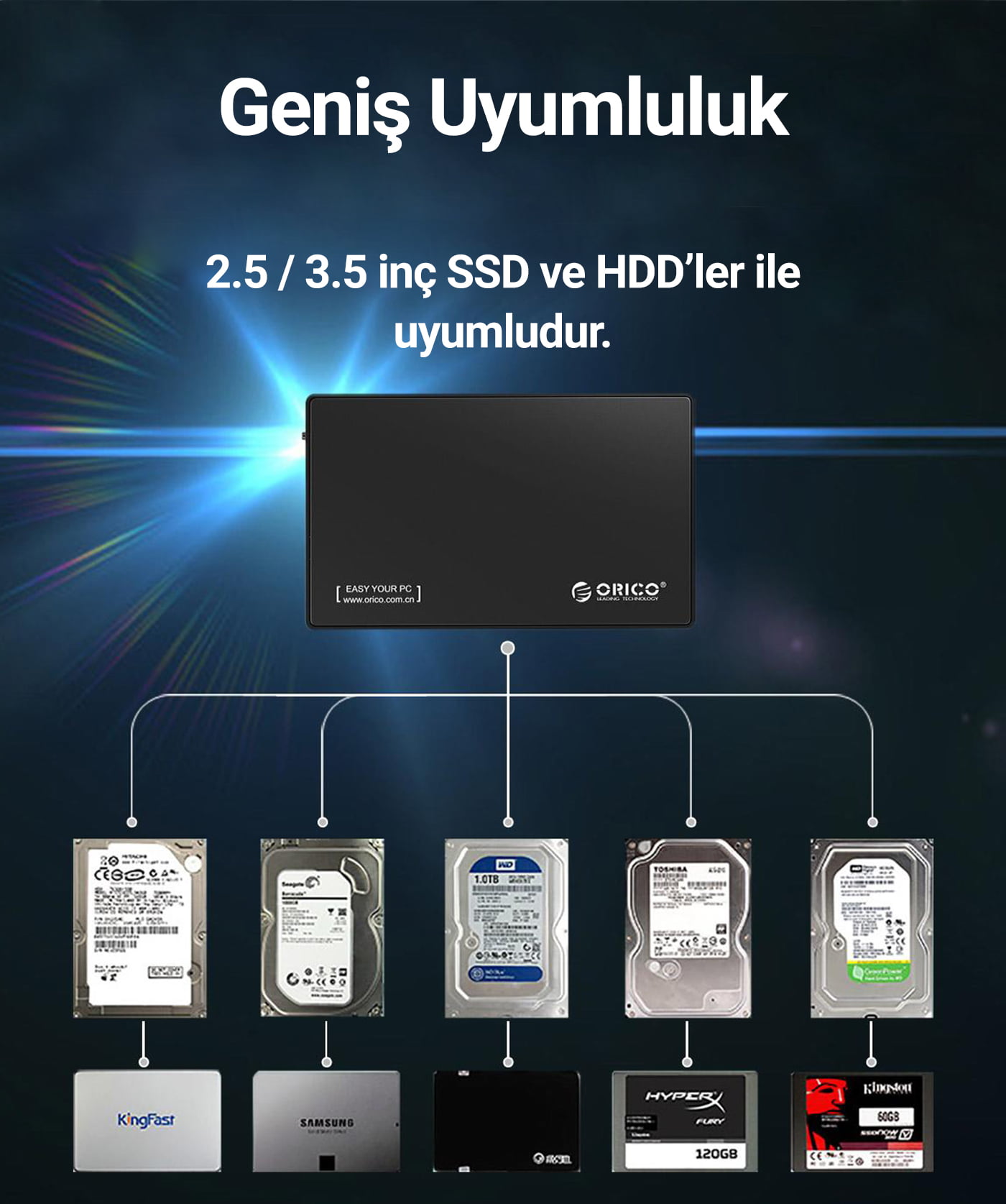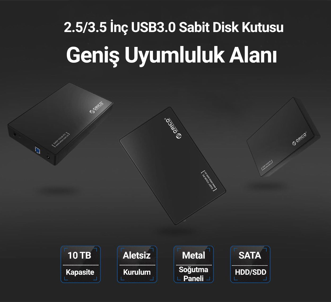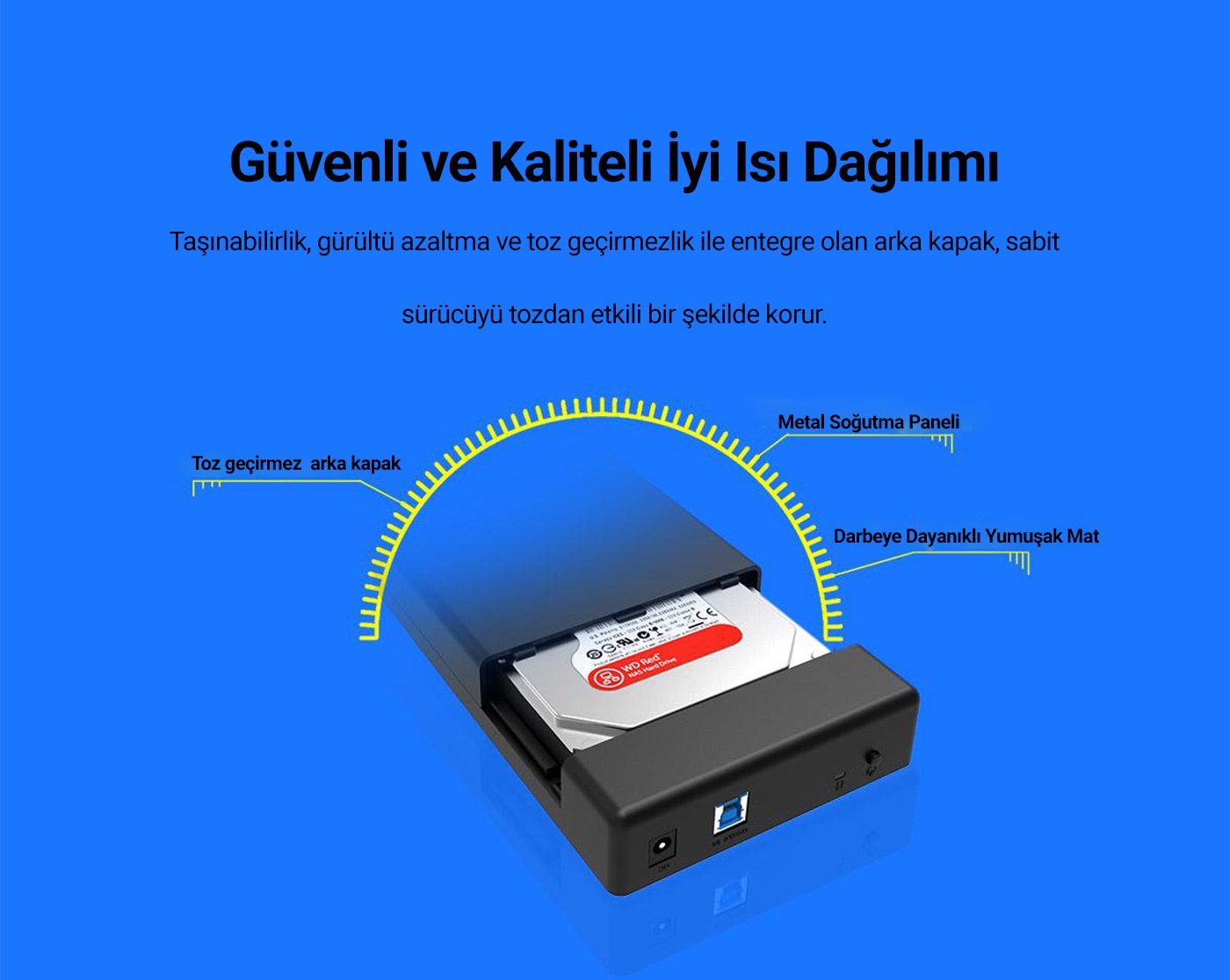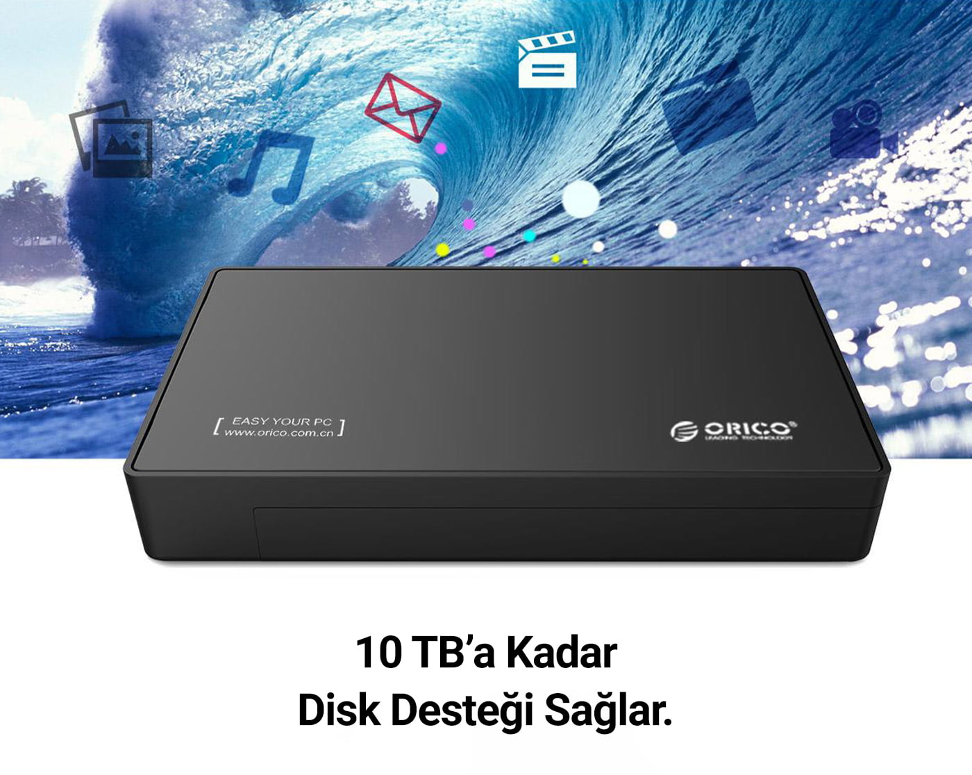 Orico USB 3.0 Type-B 6Gbps 2.5” 3.5” inch SATA SSD Hard Disk Kutusu 3,5 inç SATA I, II, III HDD veya SSD’yi taşınabilir bir depolama diski haline getirmenize olanak sağlar. Ürün, tak ve çalıştır özelliği sayesinde alet gerektirmez ve sürücü gerekmez. USB 3.0 bağlantısı sayesinde veri aktarım hızları 5 Gbps ‘ye kadar ulaşabilir. Ürünün sabit sürücü diski darbeye dayanıklı bir tasarıma sahiptir ve 10 TB’a kadar (maksimum) kapasiteyi destekler. Ürün, siyah renkte çelik ve ABS malzemeden yapılmıştır ve 12V2A güç adaptörü ile güçlendirilmiştir. Windows 10/8/7 / Vista / XP veya Mac OS 9.1 ve üzeri gibi çeşitli işletim sistemleriyle uyumludur. Ayrıca UASP dosya aktarım protokolü ile daha hızlı dosya aktarımı sağlarken Hard Disk ve SDD disklerin ömrünü uzatarak daha verimli kullanmanızı sağlamaktadır.