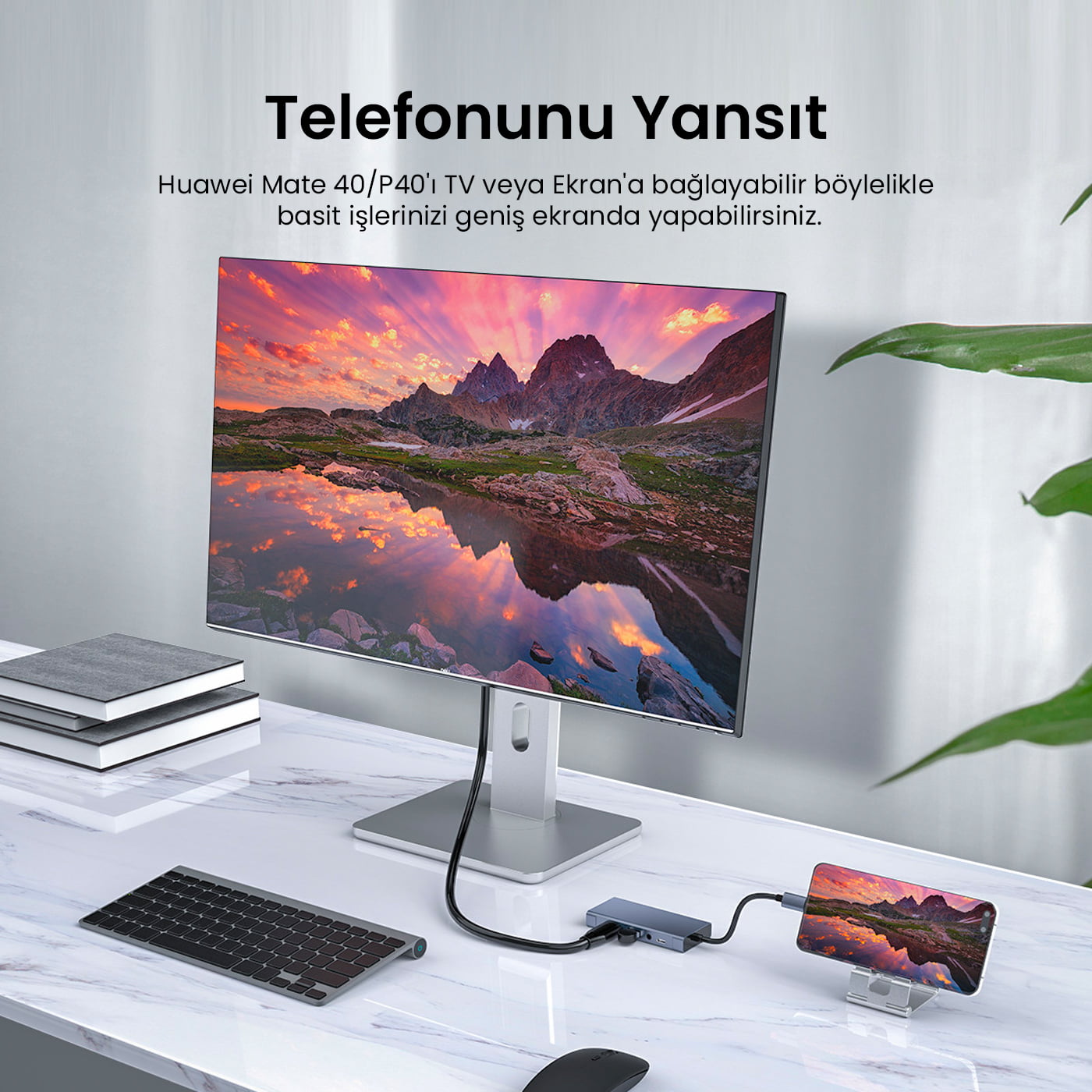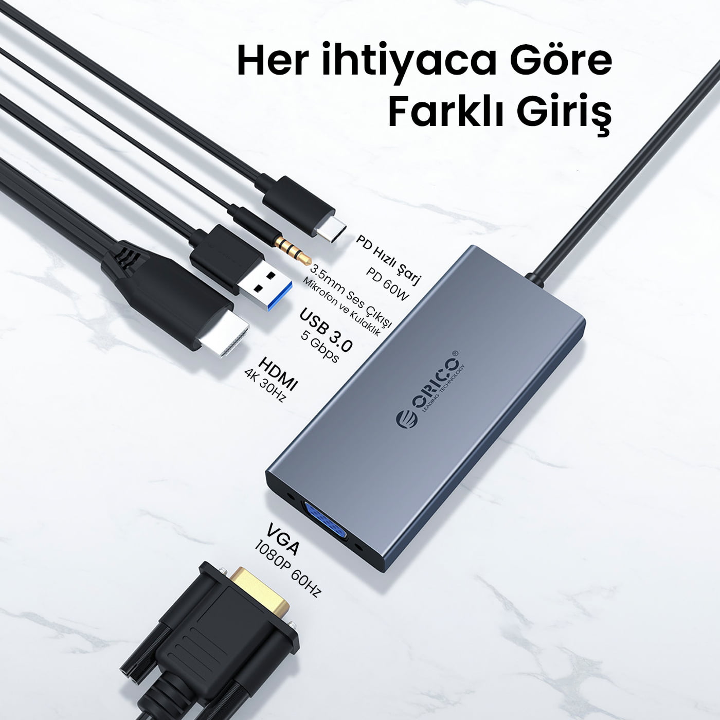 Orico Type-C to USB 3.0 HDMI VGA AUX PD Çoklayıcı Dönüştürücü HUB, Macbook veya Notebooklarınızda bulunan Type-C çıkışı üzerinden birden fazla özellik kazandırabilirsiniz. HDMI çıkışı üzerinden 4K 30Hz çözünürlükte görüntü alabilir monitör, TV veya projeksiyon gibi görüntüleme cihazlarına yansıtabilirsiniz. Ayrıca alternatif olarak VGA görüntü çıkışından da 1080P 60Hz çözünürlükte görüntü alabilirsiniz. Dosyalarınızı aktarmak veya farklı cihazları bağlamak için bulunan USB 3.0 bağlantı arayüzü 5 Gbps ‘e kadar aktarım hızlarını desteklemektedir. Ses çıkışı alabileceğiniz 3.5mm aux çıkışı yüksek netlikte ses iletimini destekler. Bunlara ek olarak HUB için güç ihtiyacını karşılamak ve bağlı olan notebook ‘u şarj etmek için 60W gücünde PD şarj girişi de bulunmaktadır. Orico Type-C dönüştürücü HUB ile ihtiyacınız olan bütün bağlantı arayüzlerine sahip olabilir ve Macbook gibi taşınabilir bilgisayarlarınızı, akıllı telefonlarınızı veya tabletlerinizi daha kullanışlı hale getirebilirsiniz.