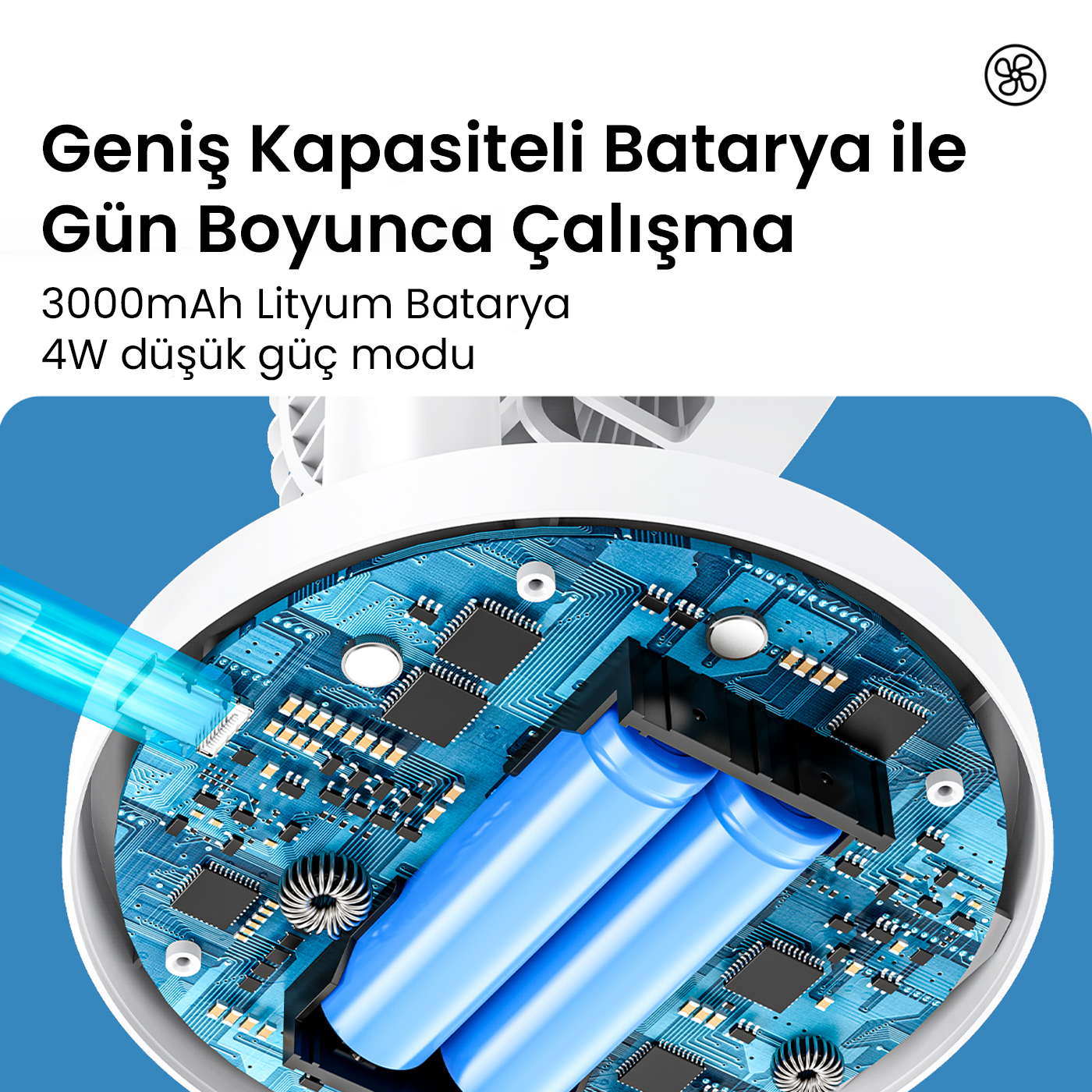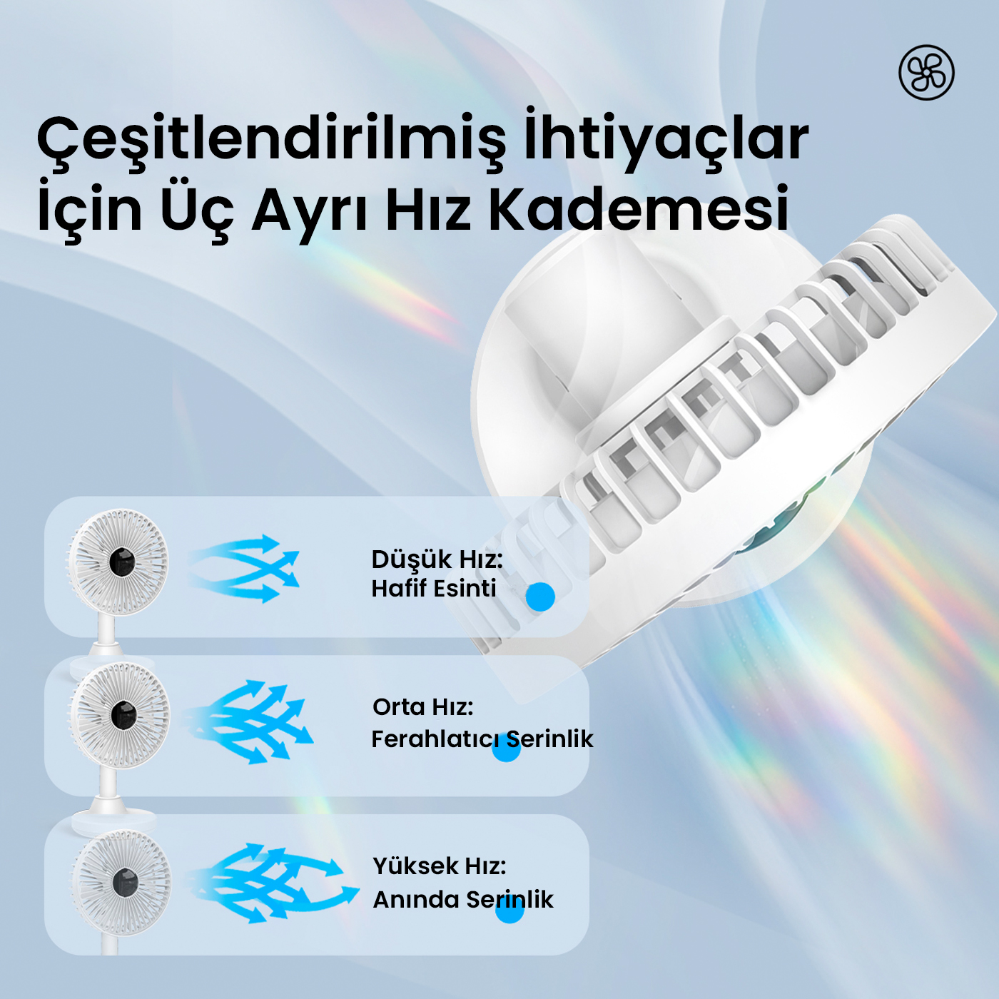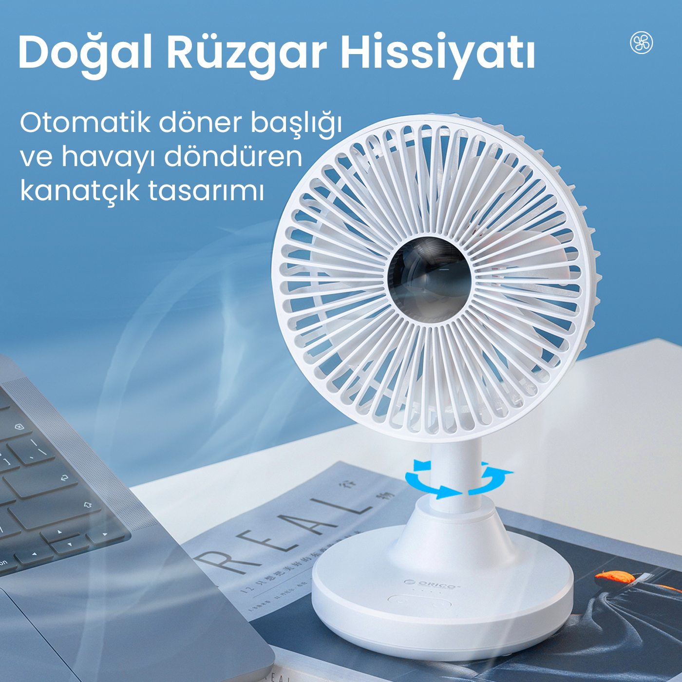 Orico 3000mAh Bataryalı Şarjlı Taşınabilir Masaüstü Fan Vantilatör Pervane, sıcak yaz günlerinde sessiz çalışması ve yüksek performansı sayesinde etkili bir serinletme sağlar. 3000mAh kapasiteli bataryası 7 saate kadar aralıksız çalışma süresi sunarken arka tarafta bulunan USB-C güç girişi sayesinde kablolu olarak da kullanabilirsiniz. 3 kademeli fan ayarı vantilatörü düşük, orta ve yüksek hızlarda çalıştırarak hava akışını ayarlayabilmektedir. Sağa sola dönebilen başlığı havayı gerçek rüzgâr hissiyatında yönlendirir. Kaydırmaz tabanlı düz zemini masaüstüne kolayca konumlandırmanızı sağlar. 360 derece dönebilen yapısı sayesinde hava akışını istediğiniz bölgeye yönlendirebilirsiniz. Geniş kullanım alanı sayesinde evde, dışarıda veya iş yerinizde rahatlıkla kullanabilir ve serinleyebilirsiniz.