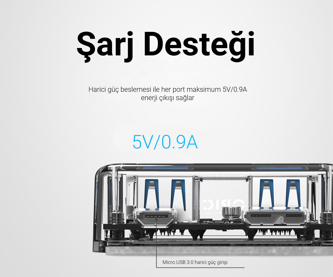 Orico Şeffaf Led Işıklı Dört Portlu USB 3.0 Çoklayıcı HUB, kısıtlı olan USB portlarınızı çoğaltmanızı sağlar. Üst kısımda bulunan 4 Adet USB 3.0 Port 5Gbps aktarım hızına sahiptir. İçinde bulunan VL817 çip sayesinde şarj ve veri aktarımı işlemleri en stabil şekilde gerçekleşir. Kasanın alt kısmında bulunan led ışık sayesinde karanlık ortamlarda port bağlantılarınızı kurabilirsiniz. Yüksek enerji çeken cihazları bağlamanız durumunda oluşacak kesintileri engellemek için micro USB bağlantısı üzerinden enerji verebilirsiniz. Besleme durumunda her bir port 5V/0.9A güç çıkışı sağlar.